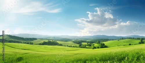 © HN Works, Fototapeta premium Grass on the field during sunrise Agricultural landscape in the summer time. Creative banner. Copyspace image