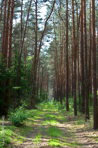 Fototapeta premium Grass path in a pine forest, Poznań, Poland
