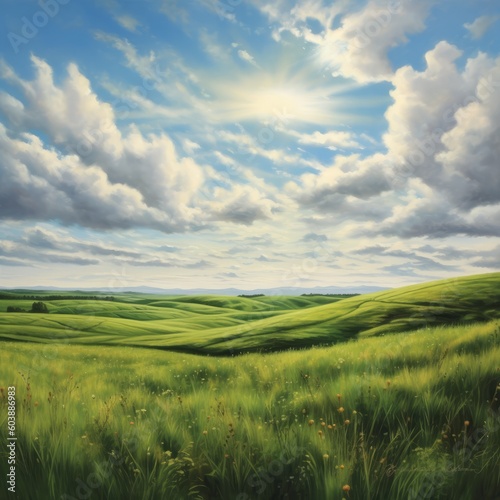 Obraz premium Grass, rolling hills, clouds, valley, peaceful, field