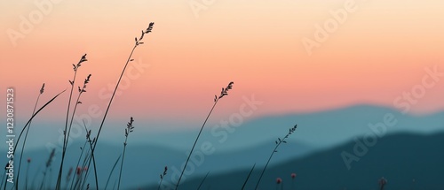 Fototapeta premium Grass Silhouettes at Soft Sunset with Mountain Backdrop