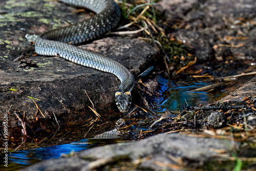 © hakoar, Obraz premium Grass snake drinking water