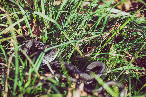 © Lelde Feldmane, Obraz premium Grass snake (Natrix natrix) bite self, called the ringed snake or water snake, is a Eurasian non-venomous snake.