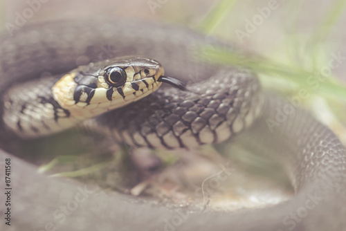 Obraz premium Grass snake or Natrix natrix curled up with tongue out close up
