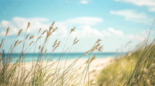 Obraz premium Grass swaying in the wind on a sandy beach with a clear blue sky in the...