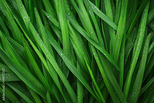 Fototapeta premium Grass with shimmering water droplets reflecting sunlight.