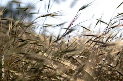 Fototapeta premium Grass with spikelets closeup in the sunshine against the sky. With blurry...