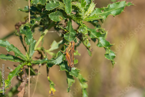 Naklejka premium Grasshopper on Canada Thistle in Summer
