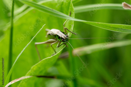 © Roman Rvachov, Naklejka premium Grasshopper on the leaf of grass close up.
