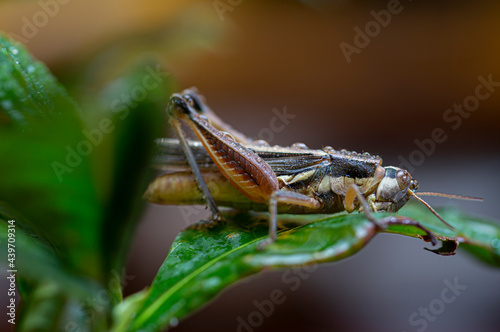 © Gabriel, Fototapeta premium grasshopper perched on a leaf with dew drops