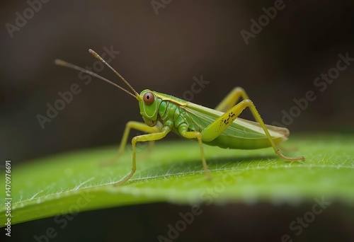 © Rans photography, Fototapeta premium Grasshopper Resting on Green Leaf Detailed Macro Shot