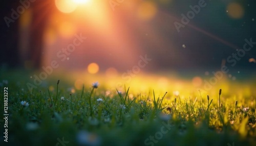 © Anulak, Obraz premium Grassy area bathed in warm multicolored light, fractured beam, soft focus, colored illumination