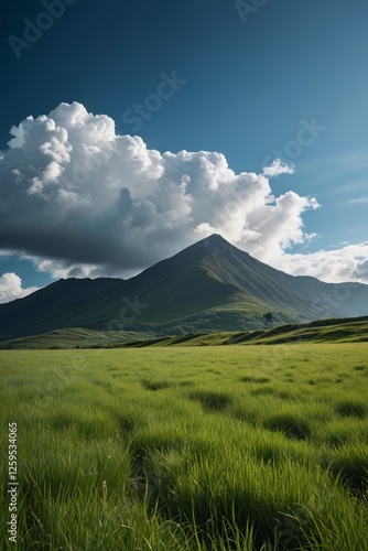 © haiqiang, Fototapeta premium grassy field with a mountain in the background