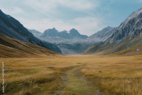 © Vii, Obraz premium Grassy Field with Mountains
