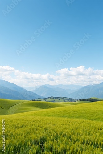 © haiqiang, Fototapeta premium grassy field with mountains in the distance