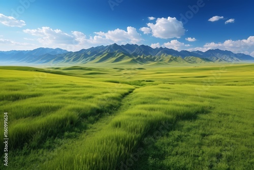 © haiqiang, Fototapeta premium grassy field with mountains in the distance