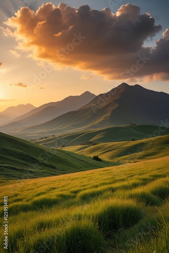 © haiqiang, Fototapeta premium grassy field with mountains in the distance at sunset