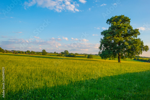 © Naj, Fototapeta premium Grassy fields and trees with lush green foliage in green rolling hills below a blue sky in sunlight in summer