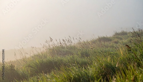 Obraz premium Grassy Hillside Whispers Serenity: Foggy Landscape with Wild Grasses