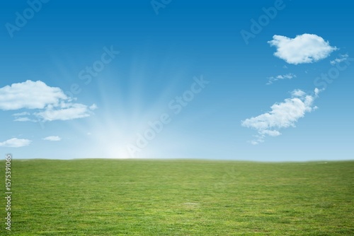 Fototapeta premium Grassy meadow is stretching under rising sun at horizon in flat design with glowing rays, clouds