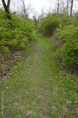 Obraz premium Grassy walking path going through forest