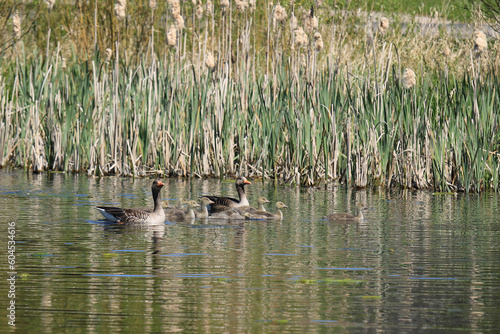 Fototapeta premium Graugänse mit ihren Gösseln auf einem Teich