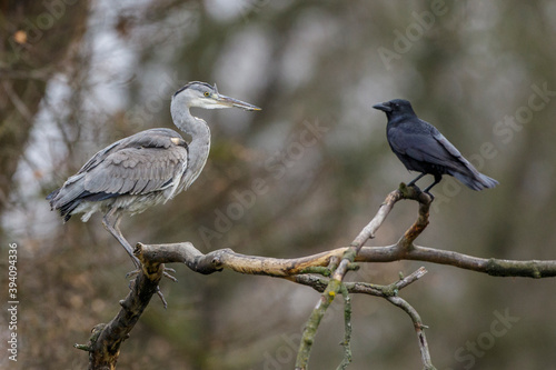 Fototapeta premium Graureiher (Ardea cinerea) und Rabenkrähe