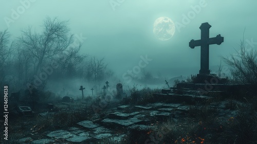 Naklejka premium grave in the cemetery with fog and moon halloween concept