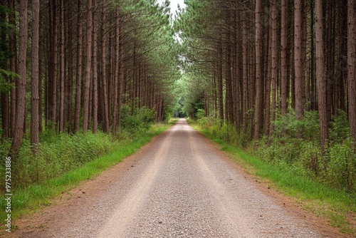 Fototapeta premium Gravel road in pine forest, rustic and rural charm