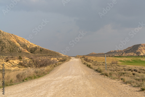 Fototapeta premium gravel road leading into a wild desert landscape under an expressive cloudy sky