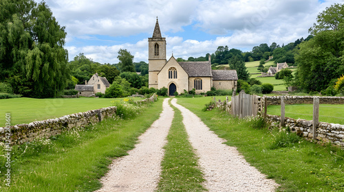 © Lailatul, Fototapeta premium Gravel road leads to historic church in idyllic English countryside; pastoral scene