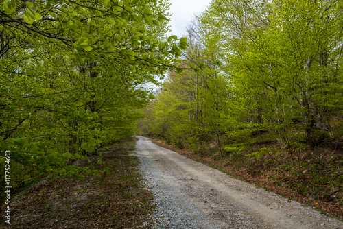 © Boragoo, Fototapeta premium Gravel road winding through a lush green forest Sunlight dappled through leaves