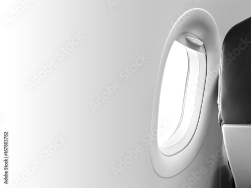 © tikisada, Fototapeta premium Gray aircraft window and backside of the passenger seat with black leather cover in the cabin crew, one airplane chair beside windowpane frame white background and blank space template