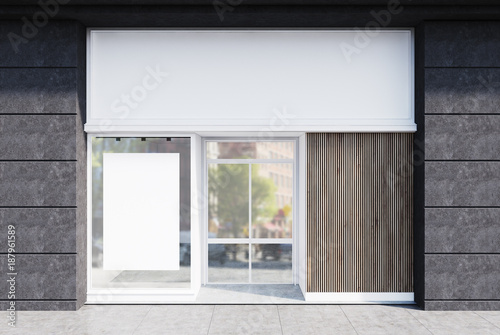 © ImageFlow, Fototapeta premium Gray and white cafe facade, poster