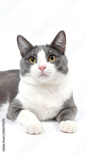 © Darul, Obraz premium Gray and white cat lying down, looking forward