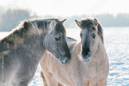 © Viachaslau, Obraz premium Gray and white horse is walking on the snow field in winter. the breath of the horses appears, cold weather