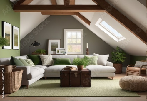© Hendry, Obraz premium Gray attic living room interior with sofa. 3d rendering