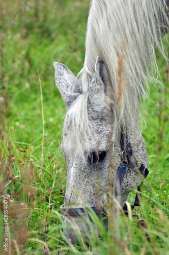 © Дина Попова, Fototapeta premium Gray buckwheat horse behind the tall grass
