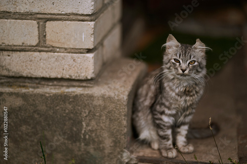 © Екатерина Мазур, Naklejka premium Gray cat near brick white wall