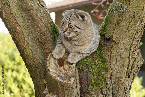 © Yuliya, Obraz premium Gray cat sitting on a tree. Gray tabby cat Scottish Fold