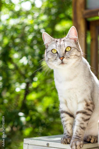 Fototapeta premium Gray cat sitting on green garden blurred background