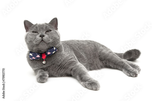 © evgenyi, Obraz premium gray cat wearing a collar with a bow isolated on a white backgro
