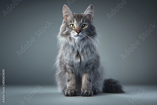 Fototapeta premium Gray Cat with Green Eyes Sitting Gracefully Against Gray Background
