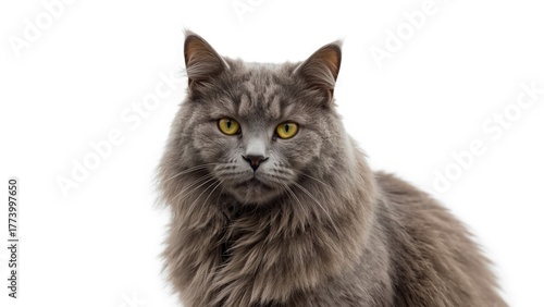 © Sona, Obraz premium Gray cat with yellow eyes, looking directly at the camera against a white background.