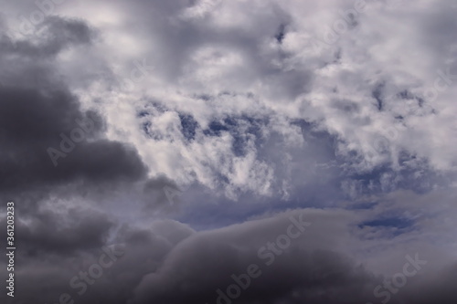 © conpuli, Obraz premium gray clouds covering a blue sky with a curtain of white clouds.