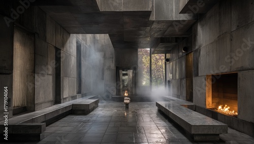 © Azkila, Obraz premium Gray concrete interior, light filtering, benches, fire