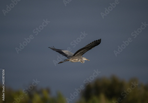Obraz premium gray crane in natural conditions hunts fish on the river