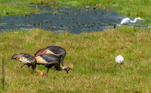 © Brian Scantlebury, Obraz premium Gray crowned crane or Balearica regulorum with juvenile offspring family foraging in field
