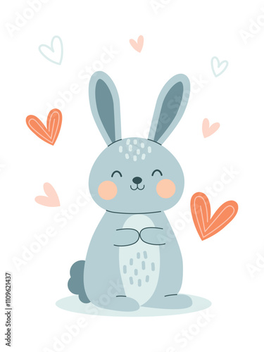 Fototapeta premium Gray cute bunny in hearts isolated on white background