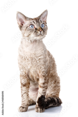 © serkucher, Obraz premium gray devon rex cat with big ears on white background