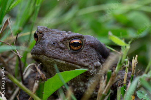 © tansol, Fototapeta premium Gray earthen frog in green grass